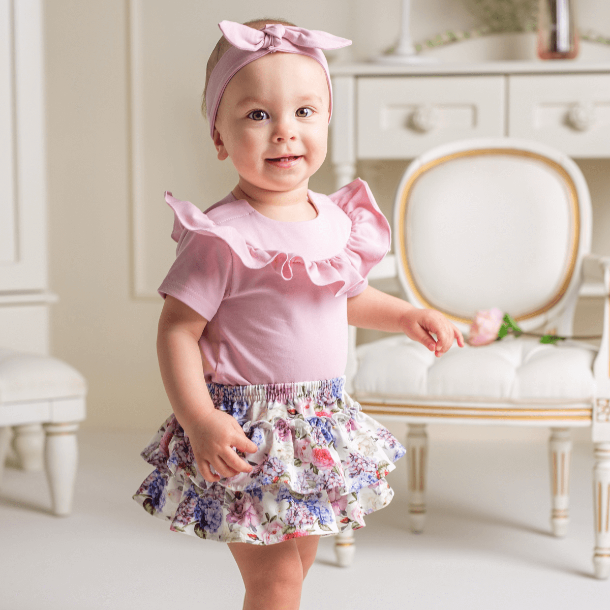 Bawełniane bloomersy ze spódniczką z dwoma falbanami w hortensje. Dekoracyjna kokarda z przodu.