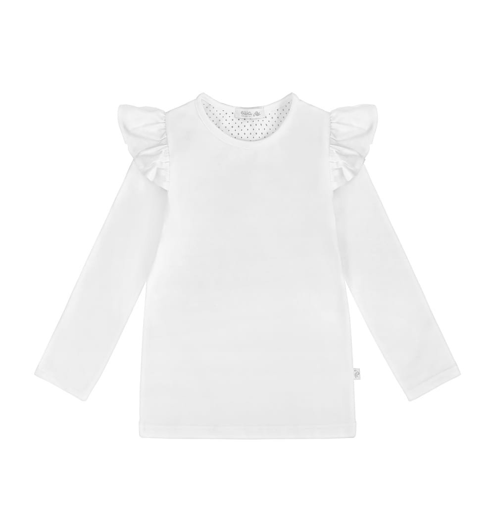 Biała bluzka z długim rękawem dla dziewczynki. Na ramionach ozdobne skrzydełka.