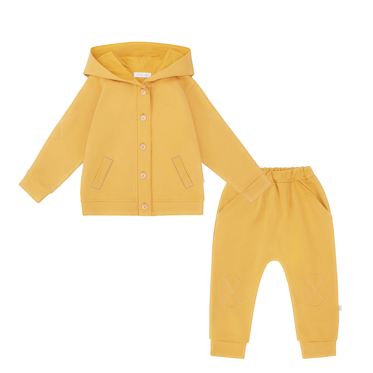 - Komplet dresowy; bluza z kapturem "kangurka" zapinana na drewniane guziki