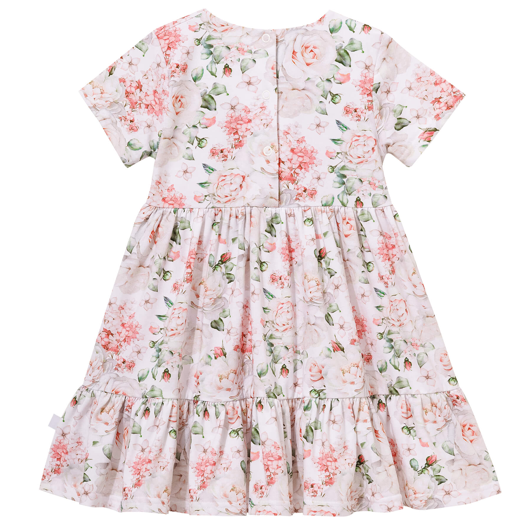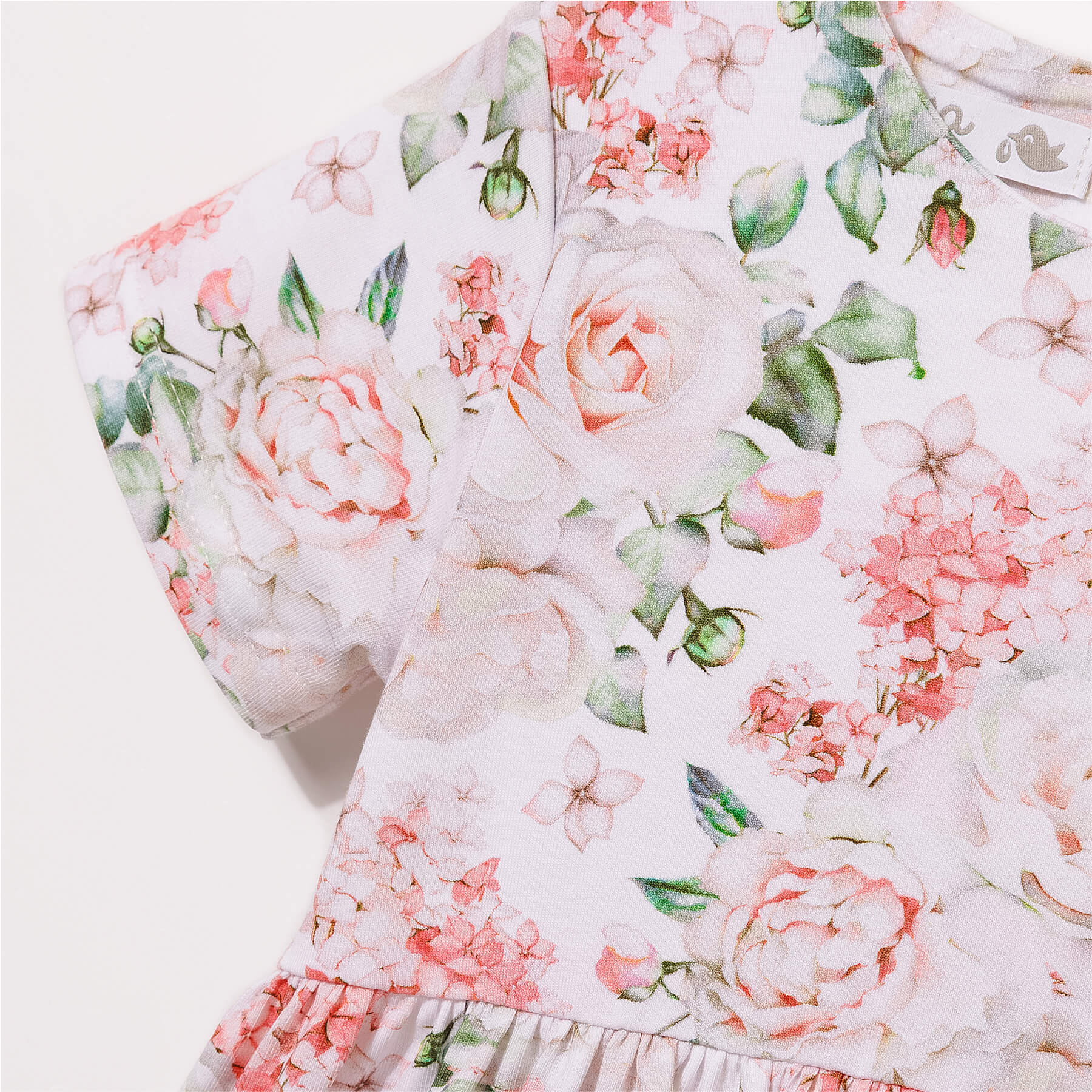 Model zachwyca subtelną falbanką w dolnej części, dodającą lekkości i dziewczęcego uroku. Dziewczęcy kwiatowy print sprawia, że sukienka jest uniwersalna i świetnie komponuje się z różnymi dodatkami. Praktyczne napy na plecach ułatwiają zakładanie. Uszyta z wykorzystaniem niepodrażniających szwów zapewni dziecku wygodę i komfort.
